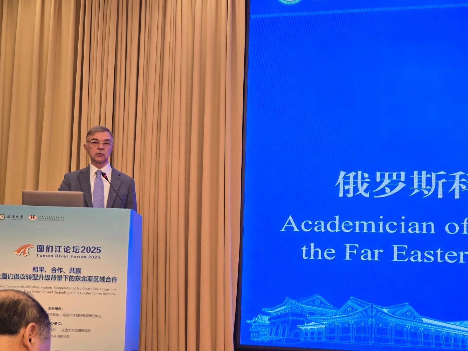 На пленарном заседании конференции в г.Янцзи с приветственным словом и докладом «Contemporary Northeast Asia from the Perspective of Global and Eurasian Continents» выступил доктор исторических наук, академик РАН Ларин Виктор Лаврентьевич заведующий Центром глобальных и региональных исследований ИИАЭ ДВО РАН.