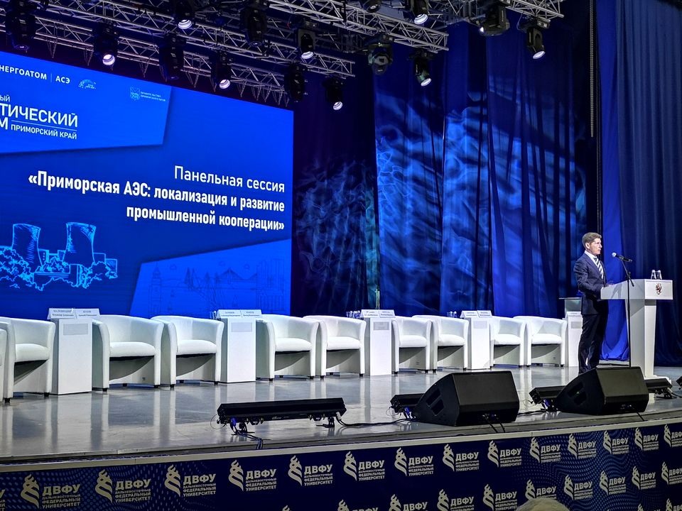 Ключевым и наиболее масштабным событием форума стала панельная сессия «Приморская АЭС: локализация и развитие промышленной кооперации». Программа сессии охватила практически весь спектр вопросов, связанных с будущей станцией: Владимир Алексеевич Малюшкин, заместитель председателя Правительства Приморского края, выступил с докладом «О влиянии строительства АЭС на экономику и энергосистему региона». Алексей Геннадьевич Жуков (АО «Атомстройэкспорт») представил проект сооружения Приморской АЭС. Александр Владимирович Баринов, первый заместитель генерального директора – директор филиала АО «Концерн Росэнергоатом» по реализации капитальных проектов, рассказал о выборе площадки: энергостроители и представители властей остановили свой выбор на пункте «Раздольное» под Уссурийском.